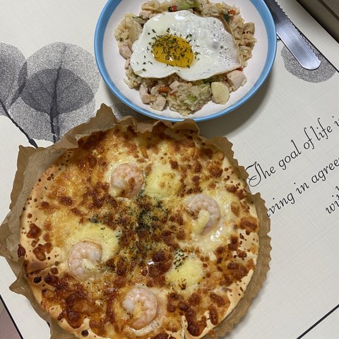 친구가 후다닥후라이팬을 돌리더니 마늘닭가슴살볶음밥이랑 피자를 대령하더라구요