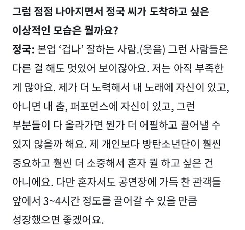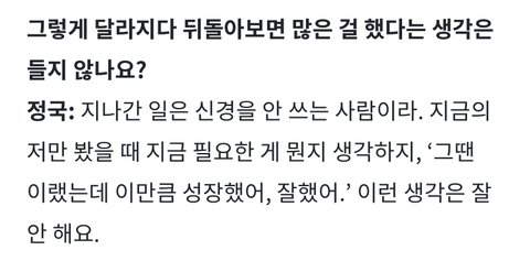 많은 걸 이뤄냈음에도 지나간 일이니 스스로한테 성장했어 잘했어라는 생각은 안한다는 말 너무너무 정국이같아.. 스스로에게는 한없이 기준이 높고 평가도 야박해서 잘한 부분보다 늘 부족했던 모습 생각하고 자책하고 괴로워하고 더 성장하려고 노력했던 정국이의 모습이 너무 잘 담긴 인터뷰였다,,
