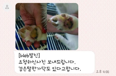 확인하기위해 발도장(발바닥이 전부 검은게 아니라 무늬가 있음) , 수염위치 수염색깔 (한쪽수염만 유독 한가닥만 검은색), 콧구멍 한쪽에 하얀무늬