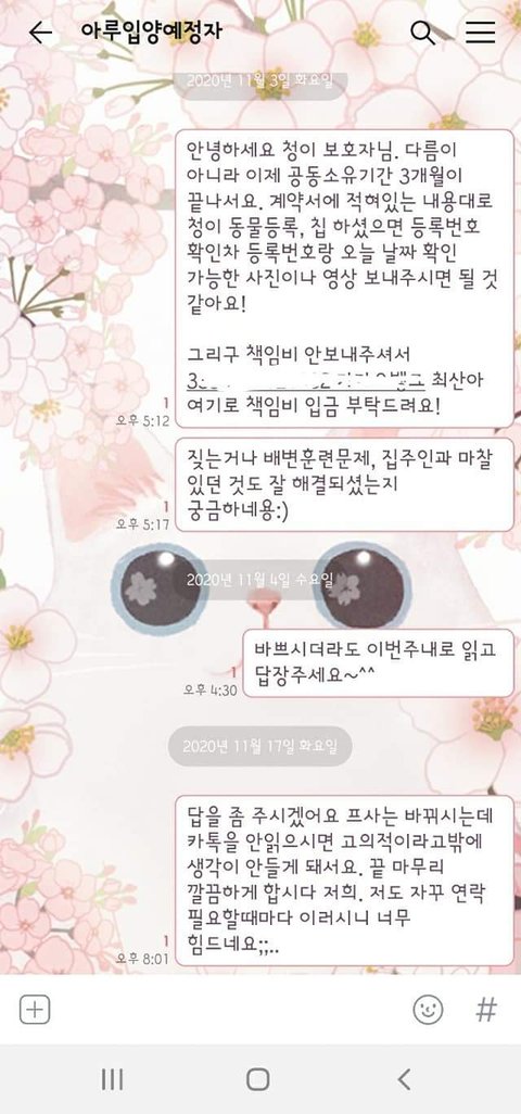 저희는 혹시 몰라 입양자측과 연락을 하기 위해 갖은 카카오톡 메시지를 하였지만