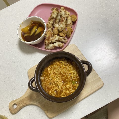 해장 겸 냉장고도 털겸 파송송라면끓이고~ 저번에 포장해온 탕수육 후라이팬에 튀겨서 먹었어요