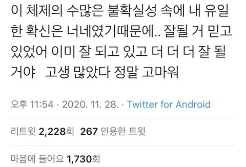 무슨 상황인지는 잘 모르겠는데 대상 너무 축하해 타팬이지만 엔시티 망돌이라고 하는 사람들은 이전 가요계 상황과 지금 가요계 상황이 너무 다르다는 걸 좀 알아줬으면 좋겠어. 당장 1군과 2군만 해도 갭이 너무 커서 뜨기조차 힘든 구조인데 이 정도면 진짜 대단하다고 생각함 그리고 24 hits 진입 무엇보다 남돌팬이라면 이게 무슨 의미인지 알텐데.. 암튼 정말 정말 축하해 그리고 좀 도넘은 조언일 수 있긴 하지만 사실 대상 받고 나서 견제픽 받는 거.. 그거 진짜 잊지 말고 다음 시상식 때 되갚아줘야 그 이후로 ㅈㄴ 막장 상승세 시작되는거임