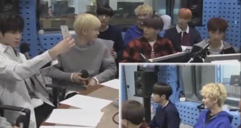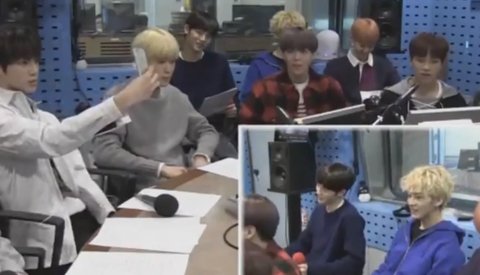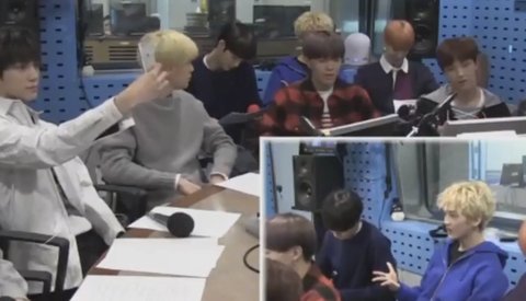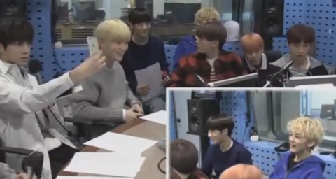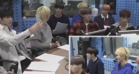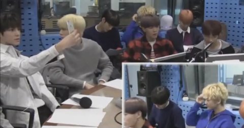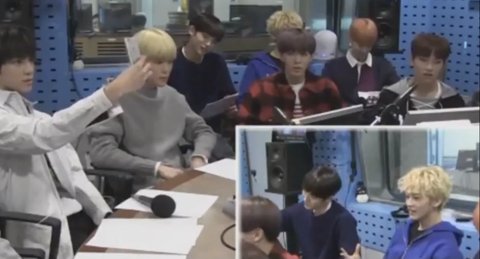 라디오 쉬는 시간에 재현이 보고 장난칠 생각에 씩 웃는 윈윈이