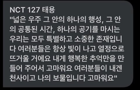 어떻게 이렇게 말도 예쁘게 할까 나에겐 너가, 엔시티가 천사이고 보물이야. 리더로서 제일 앞에 서서 멤버들을 이끌어주고 또 그 책임감을 버텨내느라 정말 힘들었을 거 알아. 그런데도 엔시티를 언제나 든든하게 지켜줘서 고마워. 태용이가 리더여서 정말 다행이야 올해 너무너무 수고했어 사랑해 오늘은 편안히 잠에 들길