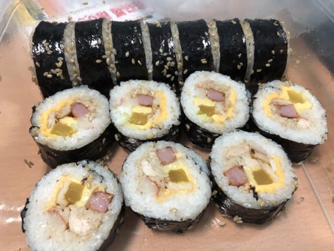 집에서 김밥 만들어 먹은날이에요. 전 야채를 싫어합니다.. 단무지로도 충분해요... 20줄싸서 신나게 먹고 나눠주고 했어요.