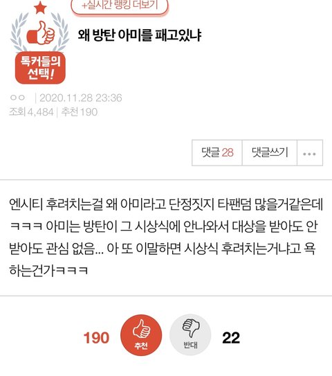 관심 없다는 글에 추천수 거의 200인데 엔시티 욕하는 댓에 추천수는 몇개야? 10개는 됨? 진심 왜 여기와서 짹이랑 다를게 없는 무개념 아미라고 싸잡아서 욕하는지 모르겠음 그것도 익명제인 판에서 ㅋㅋㅋㅋ 추천수만 봐도 판에서는 엔시티 욕할 생각 없는 아미들이 더 많은거 안보이냐..? 싸울꺼면 짹가서 싸워 제발