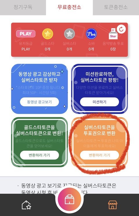 스타플레이 앱 깔고 가입하면 실버토큰 100개 주는데 표시한 버튼 눌러서 그걸 투표권 10장으로 반환하면 돼 실버토큰 10개당 투표권 1장임