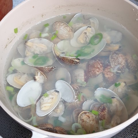 끓는물에 바지락넣고 입벌릴때까지 끓이다가 흰거품 계속 건져주고 거기에 썰은 파넣고