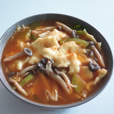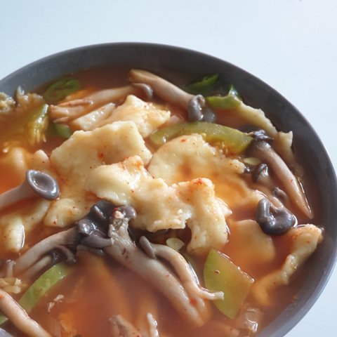 그래서 혼자 반죽해서 버섯넣고 애호박넣고 청양고추넣고 칼칼하게 끼리묵었어요.