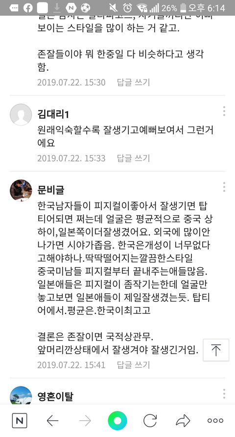 일본 살았었는데 내 생각에도 얼굴 즉 이목구비만 보면 일본이 남방계라 눈도 크고 좀 꽃미남형으로 생긴 애들의 비율은 높음. 다만...... 스타일이 뭐같고..키나 피지컬이 여자랑 다를바 없이 작고 초라함. 얼굴 존잘에 피지컬도 좋은 사람은 본적이 거의 없다고 보면 됨. 한국은 반대로 얼굴은 와... 잘생겼다 싶은 사람 별로 본적 없음. 훈남이네 정도가 많음. 근데 피지컬과 스타일이 훨씬 좋음. 그래서 전체적으로 분위기가 남자로써 매력이 더 크게 느껴짐. 개인적으로 난 후자가 좋소