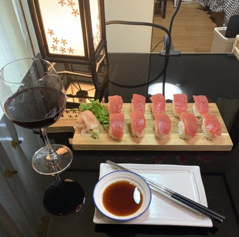 술은 무조건 어떤 음식이든 거의 레드와인.좋아하는 레드 와인& 참치 초밥초밥의 밥은 식초2:설탕1:소금0.3 으로 넣으나