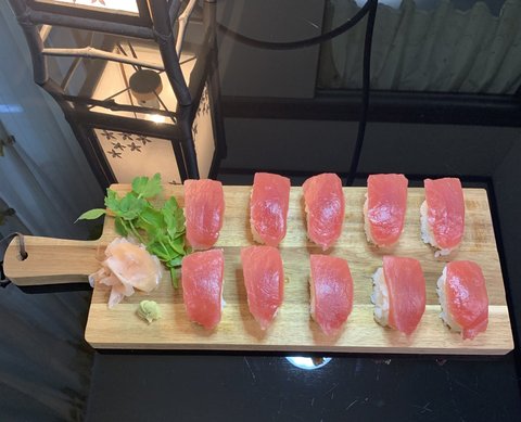 세팅할 접시에 초밥을 옮기고와사비를 취향대로 찍어주고생선회를 올려 주면 완성이다.거기에 풀떼기 또는 와사비, 생강초절임을 더해 준다.삼겹살 생각 날땐 주저 말고 먹어준다.고구마 캐롤라이나 리퍼 햄버그 카레