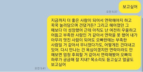 저는 19 오빠는 20이에요. 알고지낸지 2년, 4개월 썸타다가 8개월 만나고 헤어진지는 2개월 됐어요. 제가 어두운 것을 숨기려다가 차였어요. "너는 내 앞에서 우울한 걸 숨기려고 하는거야? 내 앞에서 연기하는거네? 오히려 내가 너에게 짐인 거 같아." 같은 느낌으로요.. 거기에 입시도 더불어서.. 제가 심리적으로 불안정한 상태였어요.. 오빠가 울면서 찼고 그 때 못 잡았어요 ㅠ 한번도 연락 안 했는데 이렇게 시간 지나면 후회할 거 같아서 연락해보려고 합니다ㅠ 조언 부탁드려요 ㅠㅜ 대학 붙은 것도 얘기하는 게 좋을까요ㅠ 인서울 했어요 ㅠ