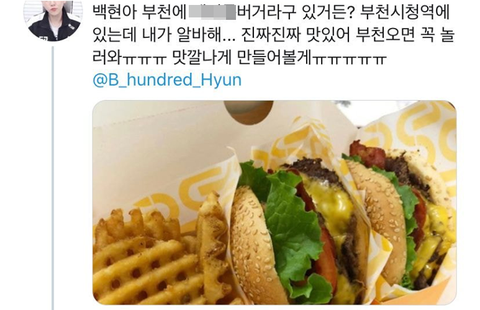 : 백혀나 부천에 ㅇㅇㅇ버거라고 내가 알바하는덴데ㅠㅠ