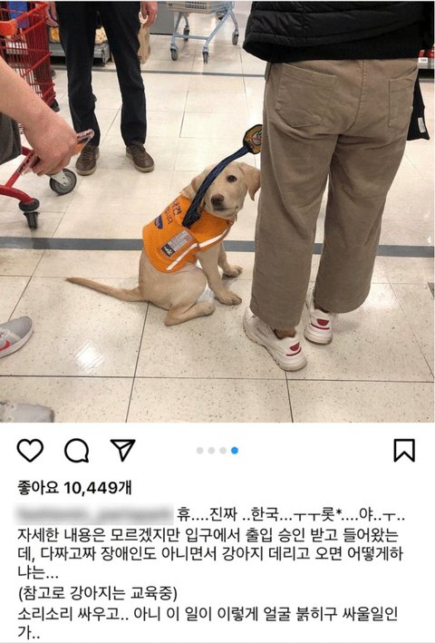 롯데마트 잠실점에서 훈련 중인 ‘예비 ’장애인 안내견의 입장을 막았다는 목격담이 올라와 논란이 일고 있다.
