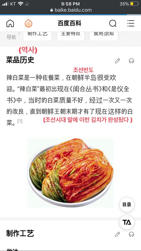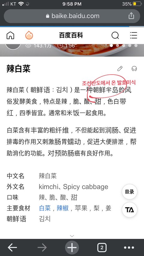 일단 이 baidu라는 웹사이트가 중국에서는 구글, 네이버 같은 존재인데 거기에 辣白菜(매운배추, 김치) 라고 치면 조선반도에서 전해왔다고 쓰여있어.