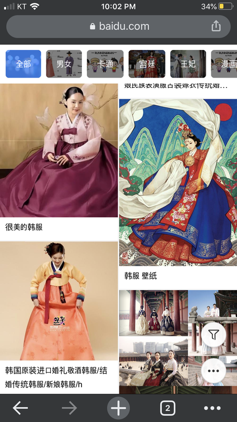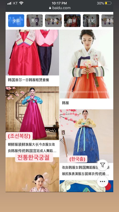 하지만 baidu에서 (한국)한복을 찾아보면