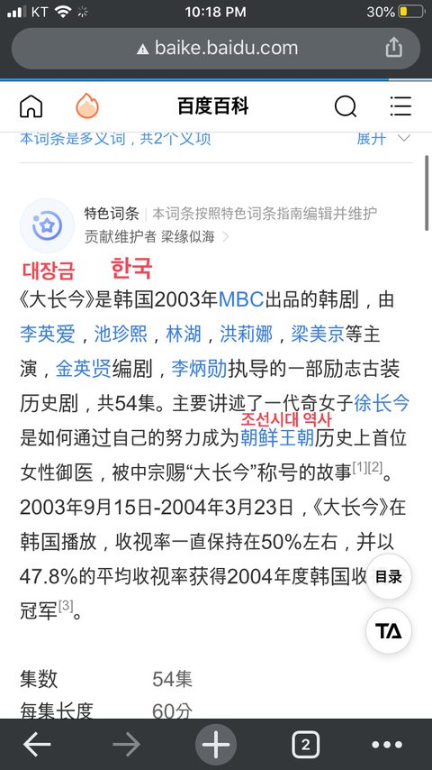 baidu에 대장금을 치면 밑에 사진의 백과페이지가 나와!!