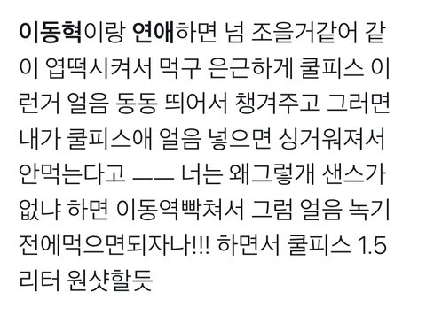 아 미친 개웃겨 걍 개웃김 ㅅㅂ 십라ㅋㅋㅋㅋㅋㅋㅋㅋㅋㅋ 왜 하필 얼음 동동 쿨피스지.. 작성자가 쿨피스 광공인가