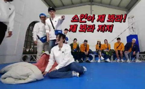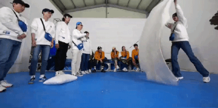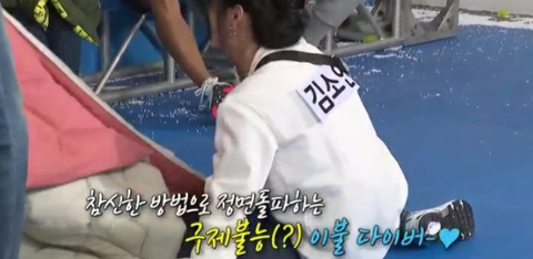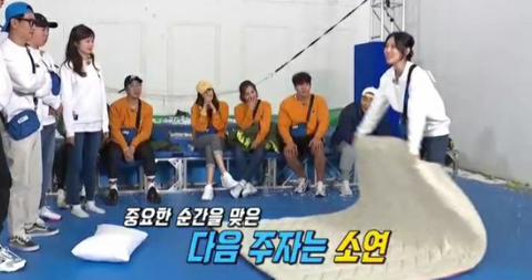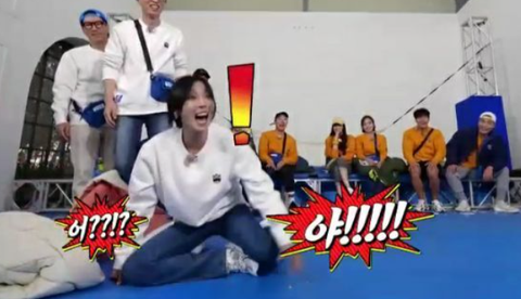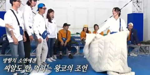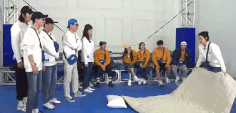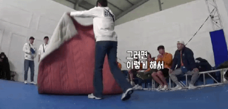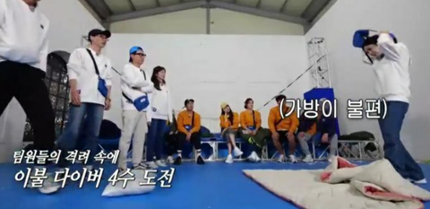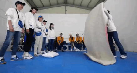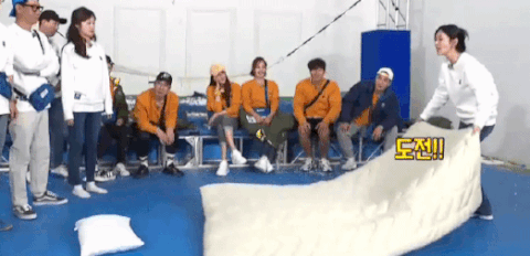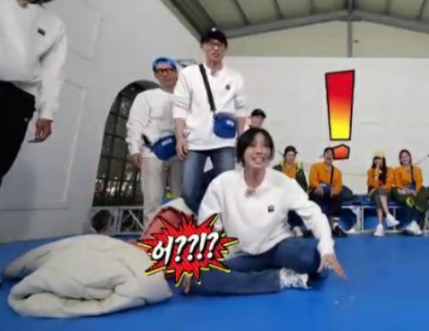 <런닝맨>에서 이불을 공중으로 던진 뒤, 이불 안으로 들어가
