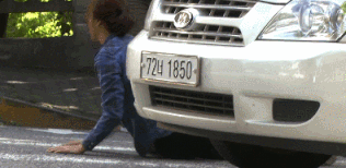 차에 부딪혀 넘어지게 되고 아무렇지 않게 일어나며 걸어감