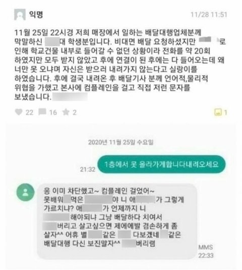 글쓴이가 함께 공개한 문자메시지에 따르면 배달원은 이날 오후 9시32분쯤 음식을 주문한 학생에게 "1층에서 못 올라가게 한다. 내려오세요"라고 요청했다. 이에 학생은 약 한 시간 뒤에 배달원에게 "이미 차단하고 컴플레인 걸었어~ 못 배워 먹은 XX야"라며 "그냥 배달하다 치여서 죽어버리고, 살고 싶으면 제발 겸손하게 좀 살자. 별 XX 같은 XX 다 보겠네. 배달대행 다신 보지 말자. 죽어버리렴"이라는 욕설이 섞인 답장을 보냈다.