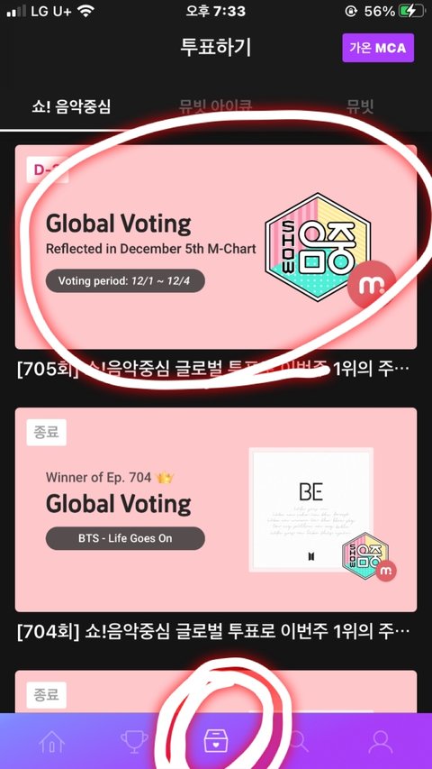 6. 표시해놓은 하단 중간 버튼 눌러서 705회 음중 투표 들어감