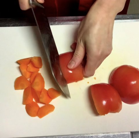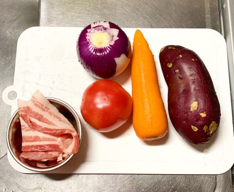 1인분이므로 당근은 반절 연필 썰기, 토마토는 한 개 모두, 껍질 깐 고구마는 반절,