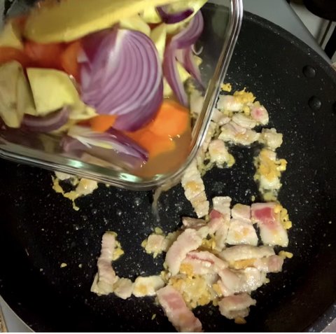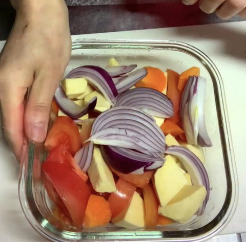 양파도 반절해서 야채를 모두 썰어 렌지용 용기에 담아 토마토가 으깨질 정도로 약5분쯤 돌려준다.