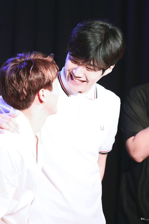 어깨를 감싸쥐고 마주보고 웃어....?