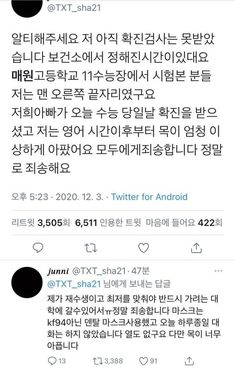 수능 끝나고 트위터에 올라온 글인데 아버님께서 수능 당일날에 확진 판정을 받으셨고 아마 글쓰니도 저걸 수능 끝난 후에 알았겠지