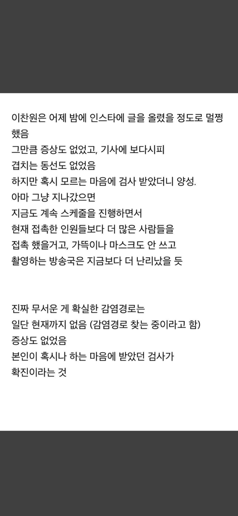 그 누구보다 놀라고 주변에게 미안해하고있을 이찬원에게 안 좋은 말보단 많은 위로와 격려 부탁하고 너희들도 코로나 조심해 :)