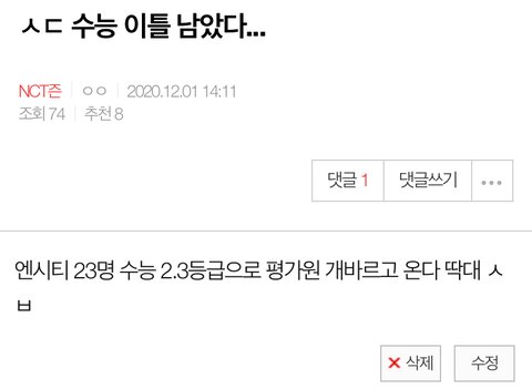 근데 평소 성적에 비해 그렇게 만족하는 성적은 아니라 수시 다 떨어지면 재수할수도 있겠지만 수능 끝났으니 밀린 덕질도 해야지 너무 행복행 ㅜㅜㅜㅜㅜㅜㅜ