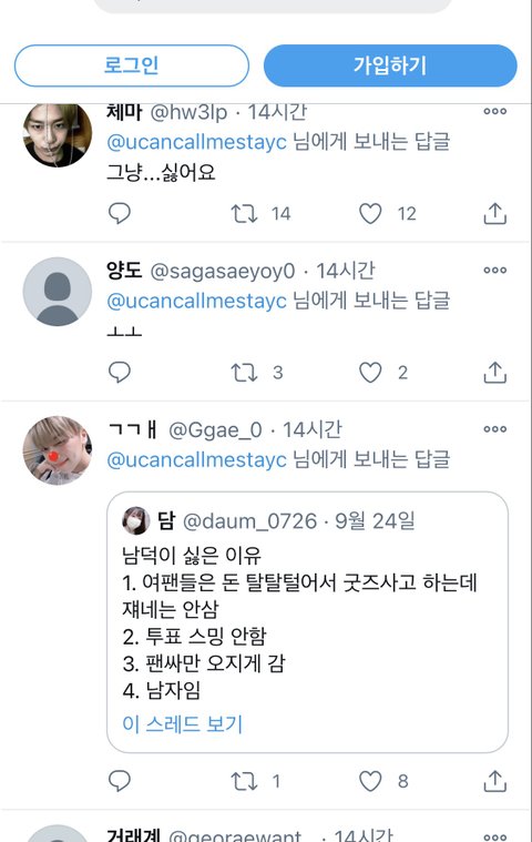 으 팬덤에 트페미 있으면 이래서 안 됨 쟤가 뭐 나쁜 짓 한 것도 아니고 친하게 지내자~ 이랬는데 닌 남자니까 이러쿵저러쿵.. 조카 인성 떨어져 보임