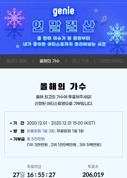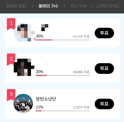 2.인터공원 올해의 음반상 투표중인데 엎치락뒤치락하고 있음 유입필요( 주의 .스크롤 내릴때 조심하기 터치한번에 다른사람께 투표할 수있음.. 어떻게 아냐고?나도 알고싶지않았음ㅠㅠㅠ