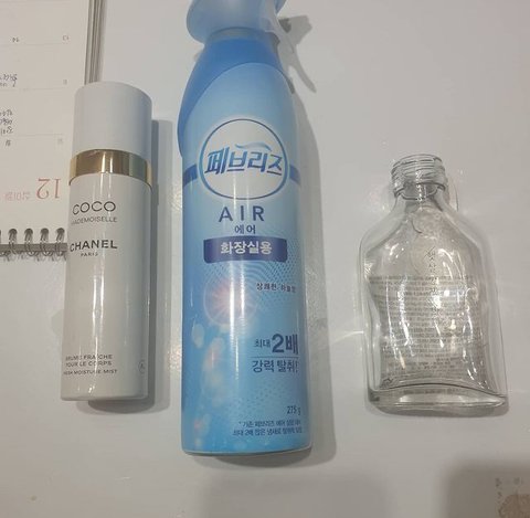 강아지 얼굴에 페브리즈 분사하는 모습