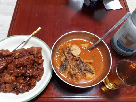 닭강정에 트레이더스에서 파는 뼈해장국 + 소맥