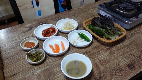 밑반찬도 깔끔하게 준비되어 있습니다. 김치, 고추 장아찌, 고추, 마늘, 콩나물, 시락국