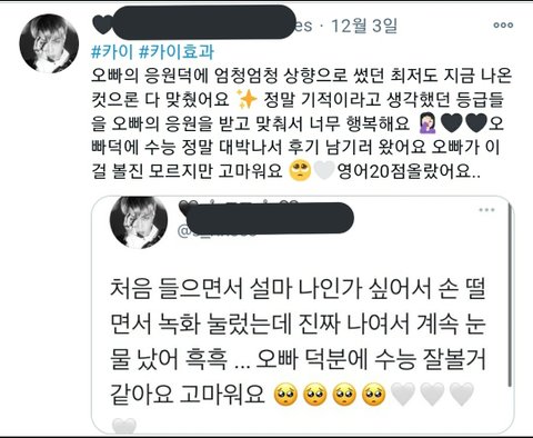 고3 엑소엘 편지 읽고 눈물 제대로 터진 우리 '신'인가수 김뿌엥 카이