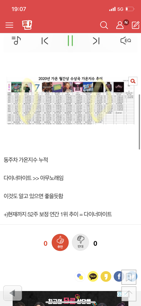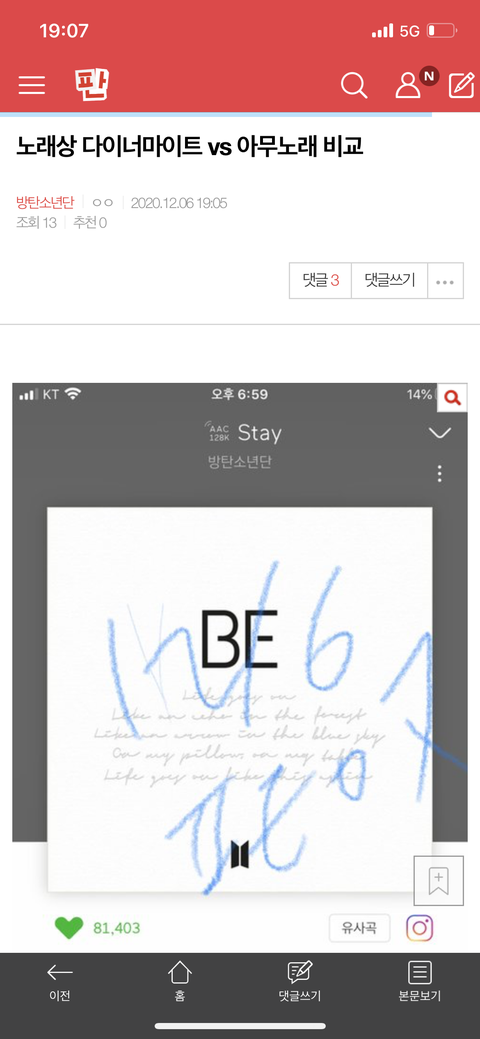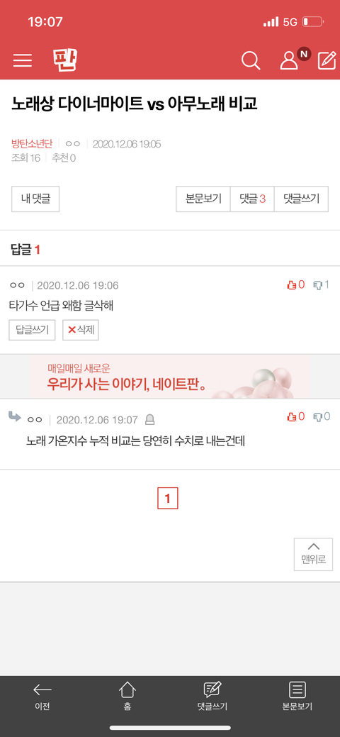 노래상 다이너마이트 vs 아무노래 비교