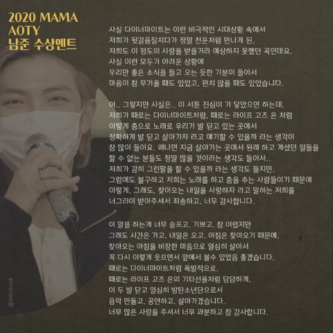 오늘 무대 보고 확실히 느낌... 진짜 무대 하나하나에 얼마나 신경썼는지 다 보였어 on, 다이너마이트 자 좋았지만 라이프 고즈 온 무대보고 울컥했음 진짜로... 처음에 마네킹인줄 알았던 사람들이 마스크 쓰고있고 하얗게 칠해져있고 정지 상태였는데 뒷 부분에서 색이 칠해지고(?) 다들 움직이고 돌아다니는데 ㅜㅠ