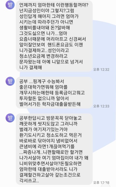 12. 서로 얼굴도 안마주치고 문자로만 싸우다가 용돈이 줄었습니다. 제가 반수를 준비했던 터라 집에만 있었는데 일주일 식비 + 용돈이 5만원이었습니다. 근데 저보고 집에있는 걸로 알아서 해먹으라며 용돈 만원만 주셨습니다. 집에 물론 먹을 게 있었지만 냉장고의 80퍼센트는 김치였고 20퍼센트는 냉동밥과 각종 양념들, 몇 년 전 얼려둔 송편 이런 거였습니다. 실온에는 라면 뿐이었고 저는 라면과 밥을 돌아가며 먹었습니다.