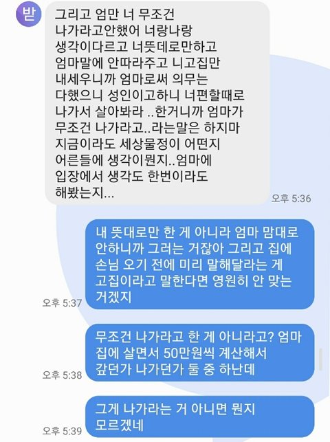 14. 그러다 엄마가 저보고 방 얻어줄테니 나가 살래서 방을 알아보고 있었는데 한 2시간쯤뒤에 "내가 왜 지원해줘야 되냐. 집 나가면 남이다." 라며 갑자기 집에서 살면서 월세 50만원 내기 or 혼자 나가살기 중 하나를 고르랍니다. 그래서 어차피 둘 다 월세내면 나가겠다니까 그건 또 안된다네요.