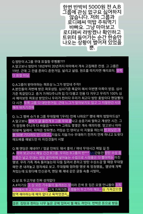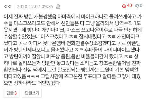 트위터에서 믿을타팬덤? 하나도 절대로 없다는 말 다시한번 뼈저리고 이갈리게 깨달았다 ㅅㅂ 난 다시는 그 어떤 타팬덤도 믿지 못할것 같음 지가수 인장달고 방탄이 상을놓고 갔네 마네 하면서 온갖 저급한 언어로 내가수를 패던 수많은 인간들 중 그 상황을 저지하거나 말리는 사람이 하나도 없었다는게 진짜 상처였고 끊임없이 올라가던 알티와 마음숫자보고 두번 충격받았음 걍 트위터도 이젠 잘 못들어갈 것 같음 물타기던 진심이던 같이 욕했던 모든 인간말종들아 방탄하고 아미 상처받은만큼 니들 본진에 돌아가길 바람.