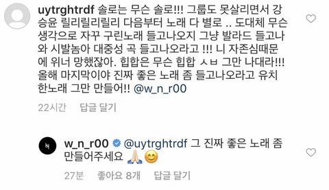 이 사진은 에브리데이 활동?쯤에 강승윤 인스타에 달린 악플임. 강승윤 평소에 악플 절대 무시하고 화난 거 절대 못 봄(본인 피셜로 평소에 절대 화를 내지 않아서 드라마 중 화내는 연기가 제일 어렵다 함) 이 정도면 위너 입덕하고 본 강승윤 모습 중 제일 개빡친 거임...