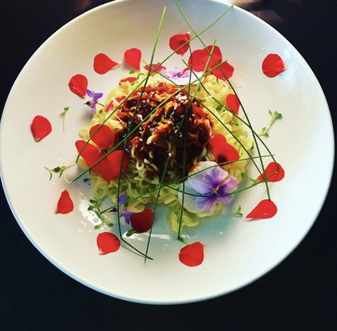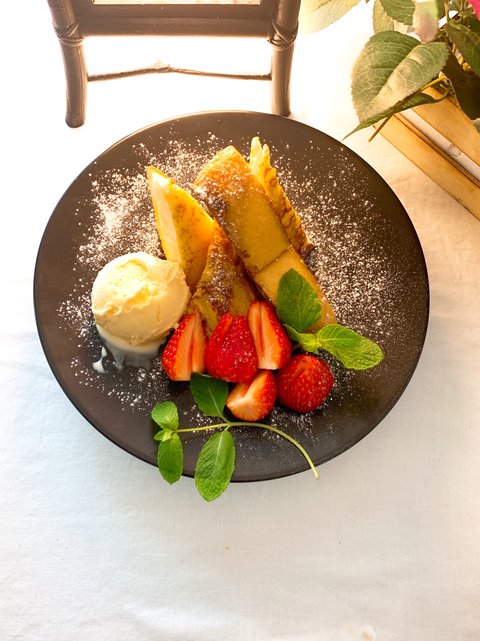 새콤한 제라늄 꽃잎과 비빔 양념이 잘 맞다.폭신폭신한 프렌치 토스트