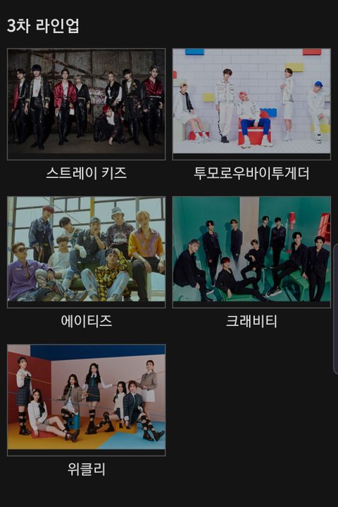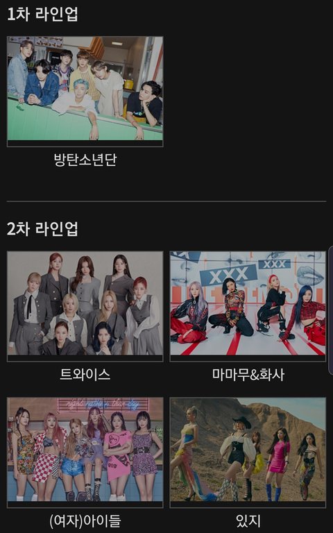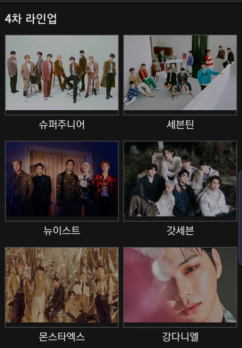 방탄, 트와이스, 세븐틴, 아이즈원, 갓세븐, 몬스타엑스, 마마무, 더보이즈, 스트레이 키즈, 에이티즈, 크래비티, 투바투, 위클리, 있지, 아이들, 제시,뉴이스트, 강다니엘,