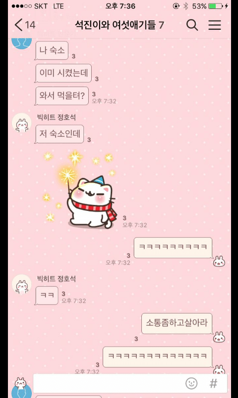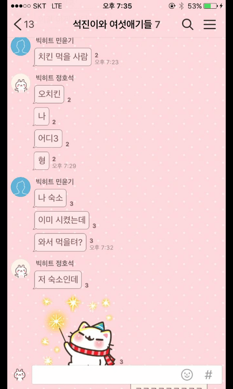 카톡 대화내용만 봐도 멤버들 음성지원 됨 ㅋㅋㅋㅋ진 이와중에 제이홉 생일인줄 알고 12시 01분에 축하문자보냈는데생일아님.........ㅋㅋㅋㅋㅋㅋ