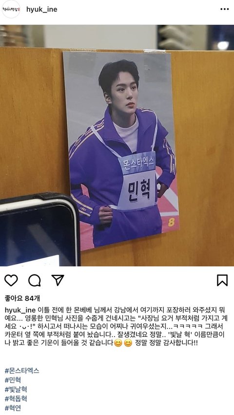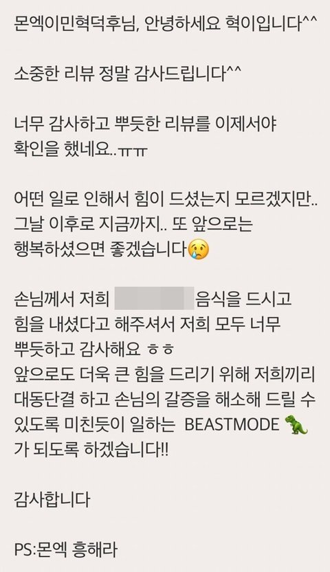 배달앱에 댓글을 남겨주셨는데 그때 손님 닉네임이 <몬엑이민혁덕후>였는데