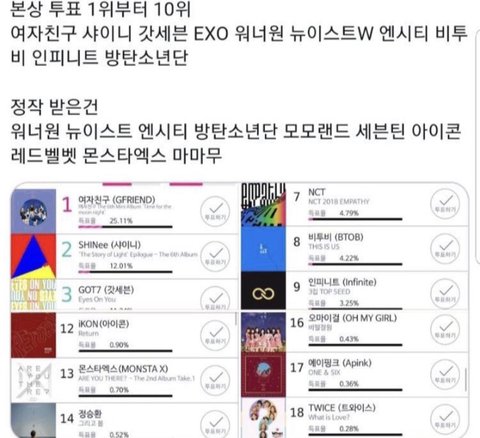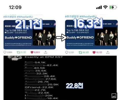 간단하게 설명하면 여자친구 서가대에서 작년에 방탄소년단이 1위하고 여자친구가 2위했는데 본상 안 주고 퍼포먼스상 하나 주고 (여자친구 데뷔날이어서 버디들이 단체로 투표해서 투표는 1위였음 심사위원 점수가 빵점이어도 여자친구는 확정일정도로 압도적이었음 ) 이번에는 리트윗 개수로 출연하는데 그걸 막으려고 리트윗 조작해서 ( 조작아니고 오류일수도 있는데 디엠 막고 그런거보면 오류는 아니라고 생각해 ) 상 못 받게 후보제외함 원래대로라면 탑 16을 뽑는데 여자친구는 14위여서 들어가고도 남았음 지금 실트 1위 떴는데 많이들 알아주면 좋겠어 제발 여자친구보다 훨씬 낮은 팀이 나온다는게 말이 안 되잖아 .. 위에는 작년 꺼 밑에는 오늘 꺼